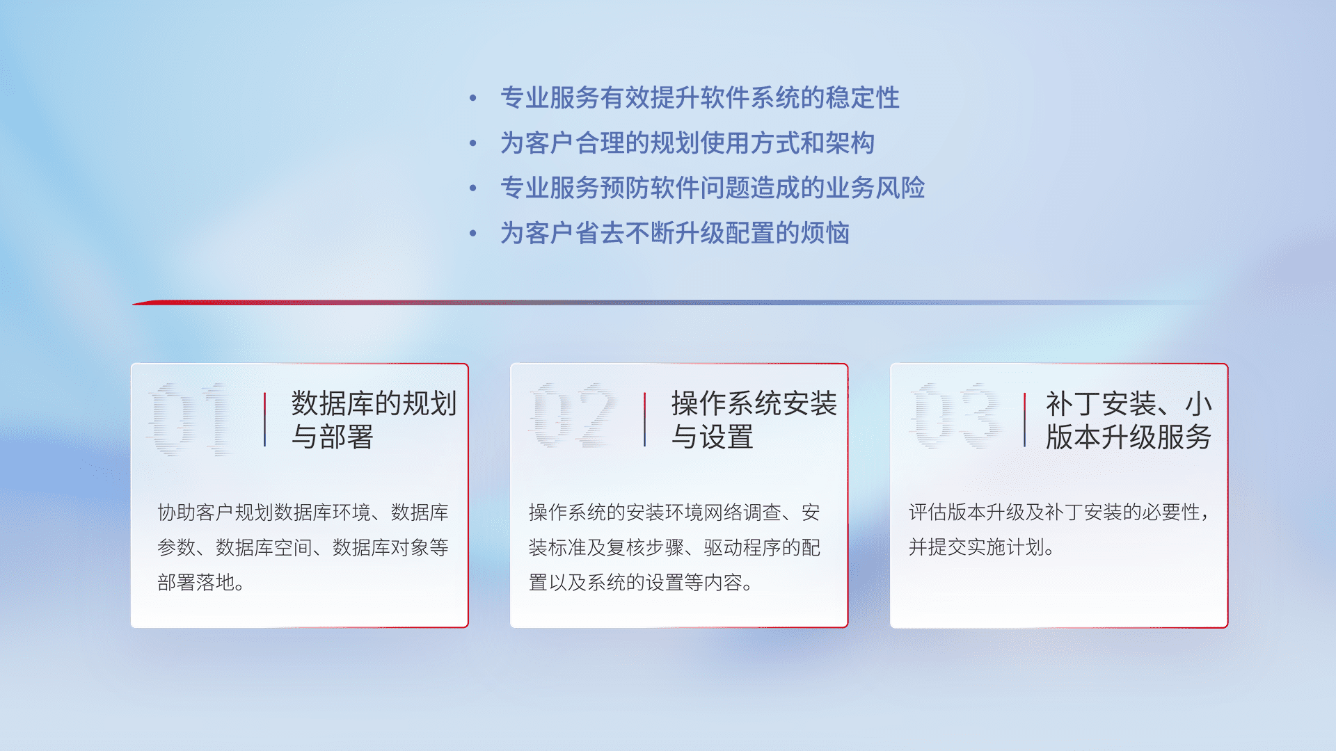 为客户提供软件规模升级、、快速部署、、按需配置的专业服务,,从数据库的规划与部署到操作系统的安装与设置,,,再到补丁安装和小版本升级提供支持。。。